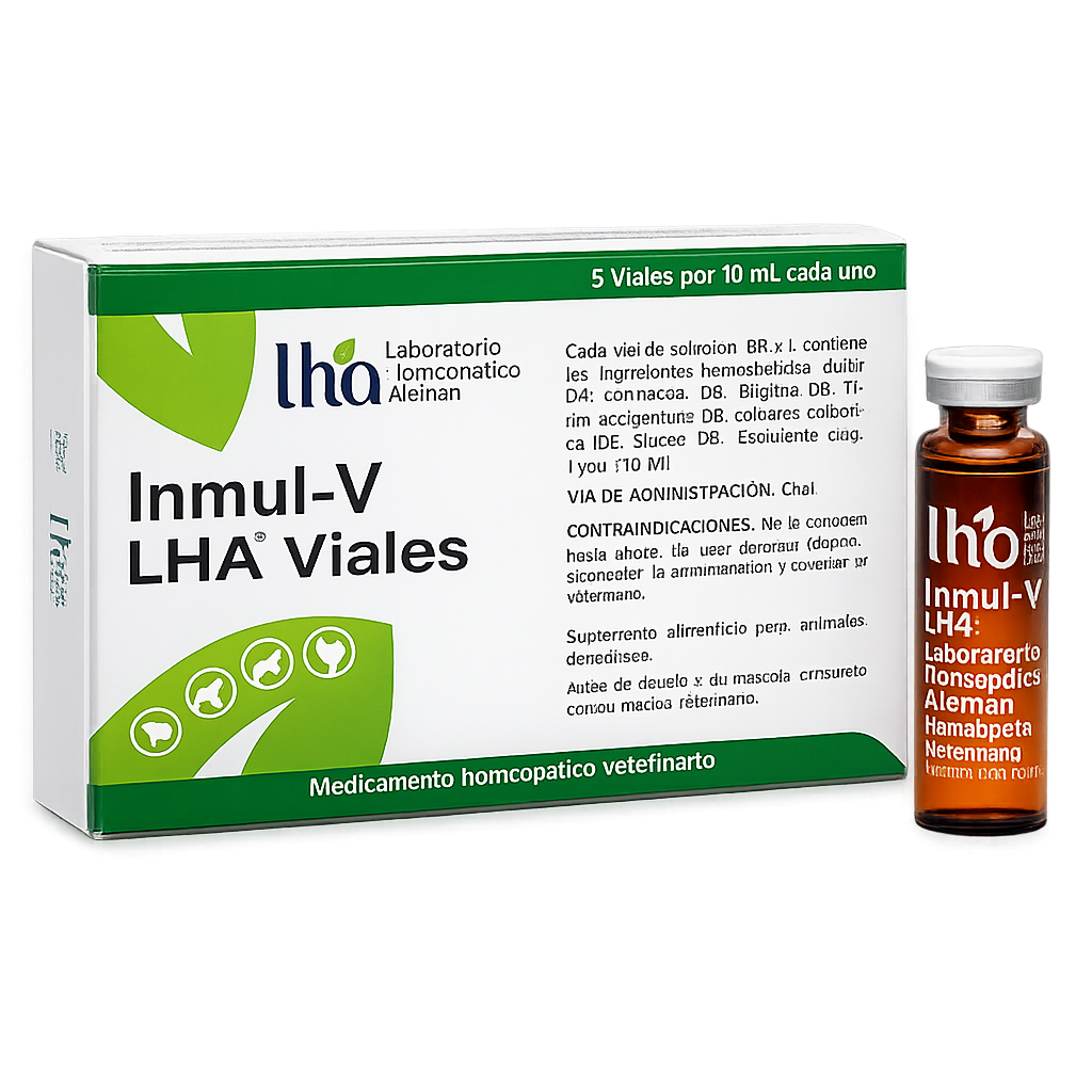Inmul-V LHA x 60 Inyectable es un medicamento veterinario homeopático, presentado en viales, que actúa como coadyuvante para estimular el sistema inmune y tratar inflamaciones, infecciones (bacterianas, virales, fúngicas), traumatismos, heridas, papilomas, carcinomas y afecciones autoinmunes, mejorando la respuesta del cuerpo a problemas agudos y crónicos sin efectos secundarios ni residualidad.
