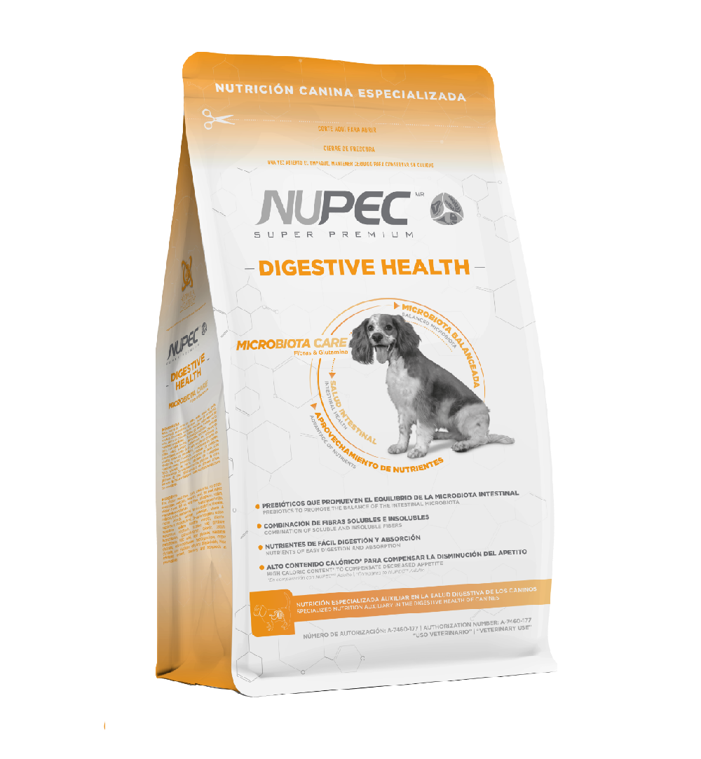 La adición de prebióticos favorece la salud intestinal ya que promueve el desarrollo de bacterias benéficas. Agregamos glutamina, un aminoácido que provee de energía a los enterocitos, favoreciendo así, la regeneración de la pared intestinal. La calidad de los ingredientes, las proteínas altamente digestibles, así como el balance de fibras, hacen de NUPEC DIGESTIVE HEALTH un alimento que promueve la salud intestinal de tu perro.