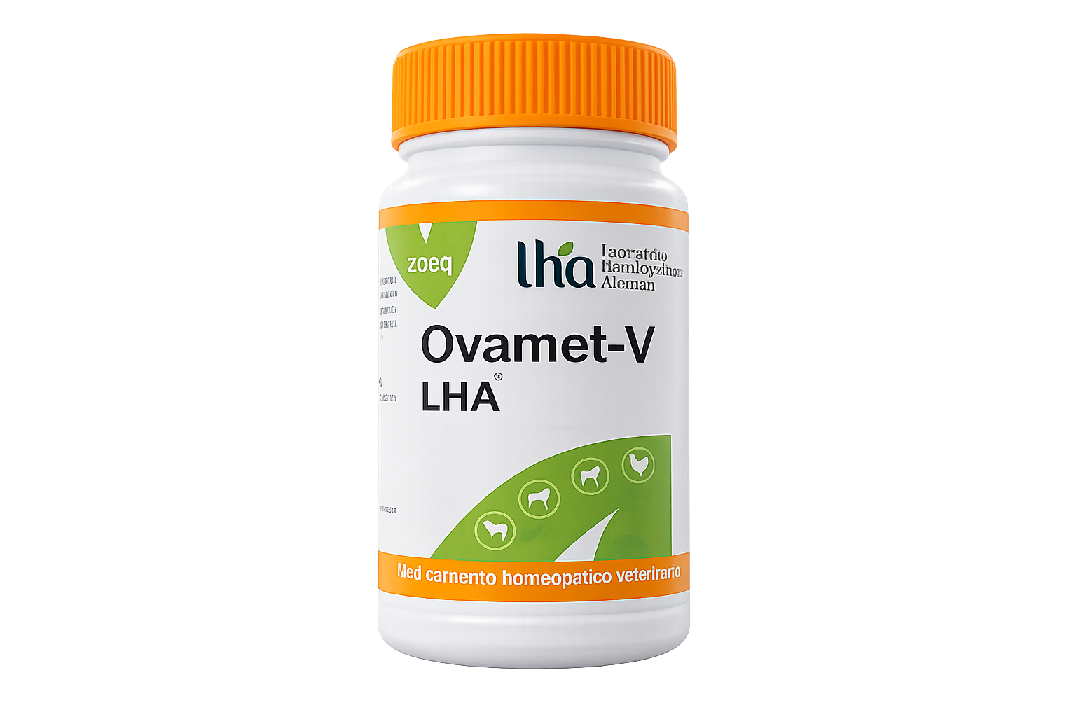 Ovamet-V LHA Granulado x 200 grs es un suplemento veterinario homeopático de la marca LHA, usado para apoyar los sistemas endocrino y reproductivo en hembras, ayudando en casos de anestros, celo silente, estrés, síndrome de Cushing, problemas de parto y más, con presentación en granulado y venta bajo fórmula veterinaria.